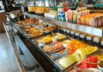 conta com restaurante, que possui buffet a quilo, sopas e caldos, pizzaria à lenha,